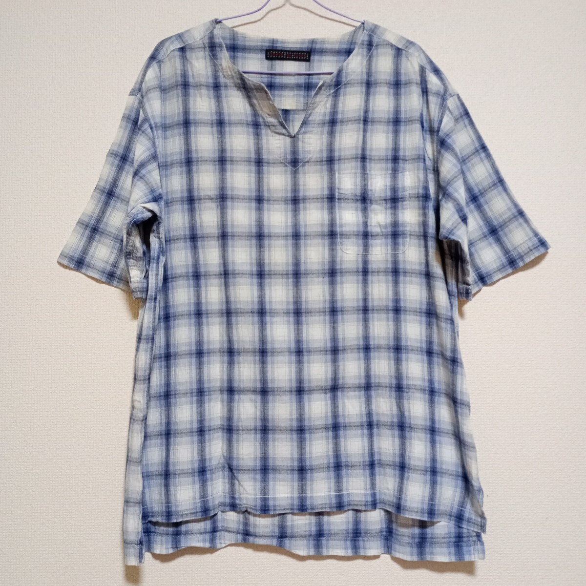 > SENSE OF PLACE 綿麻キーネック半袖プルオーバーシャツ L 白×紺×ブルーグレー