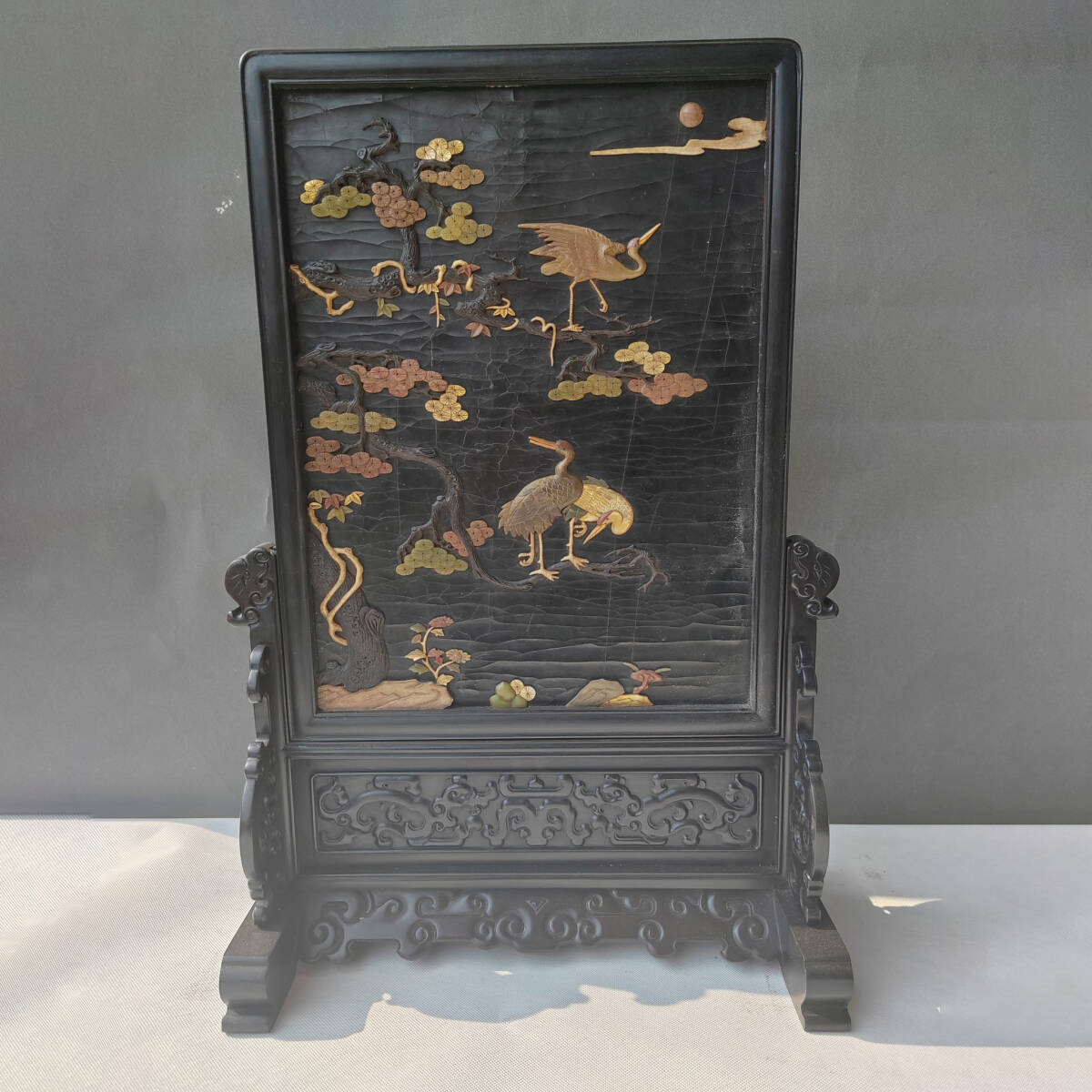 - 9_ZZ8425【惠】人間国宝 古代木工芸品 【木に宝石と玉の屏風の置物です】彫刻品 中国古美術 中国骨董 時代物 本物 珍品旧蔵 伝世家珍