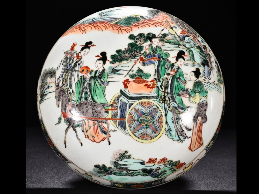 - TD119■中国古玩 唐物 大清康熙年製 款 五彩麻姑献壽人物故事紋果盒 時代物 極上品■高さ15.5cm直径27cm■