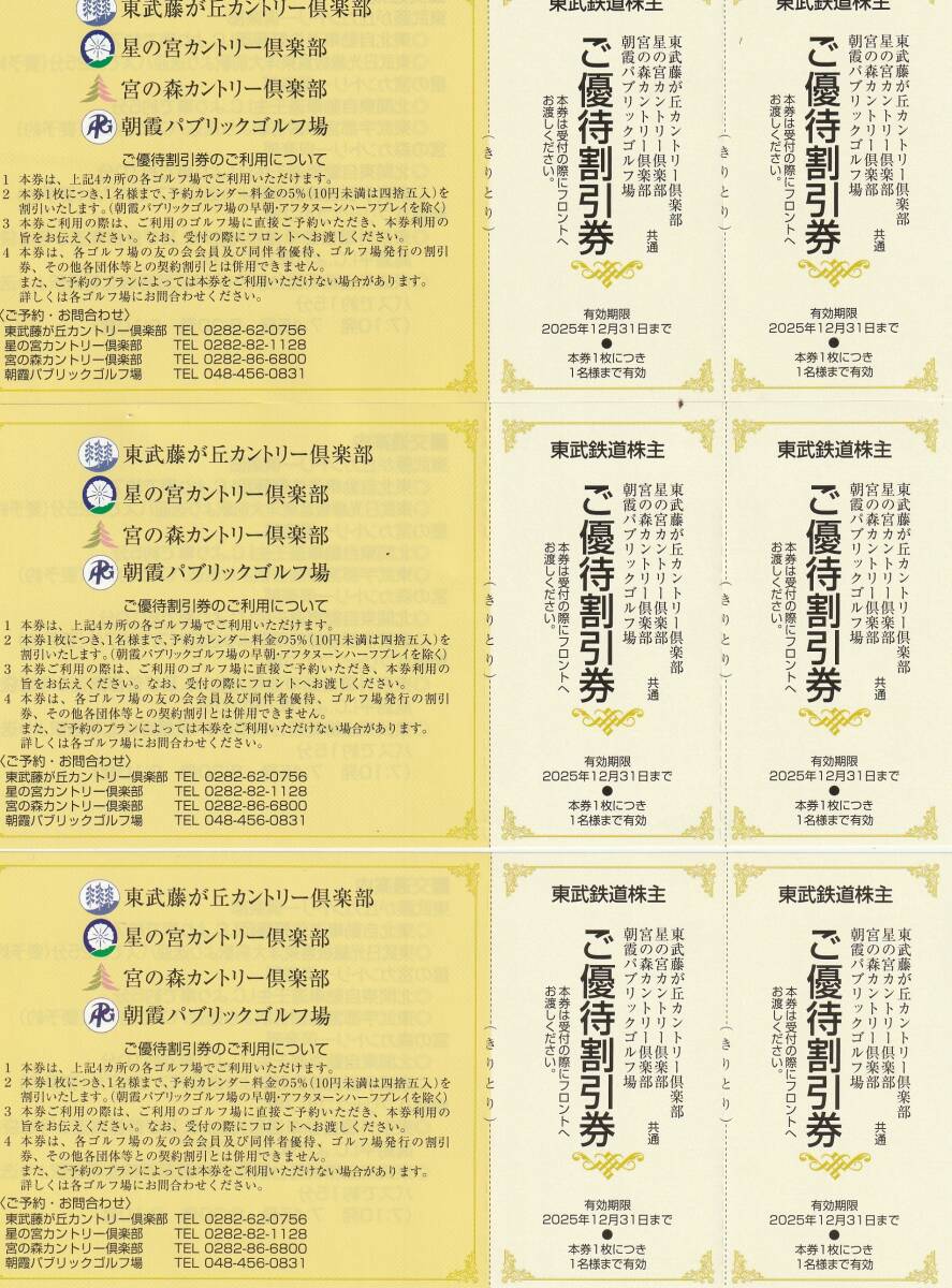 - 東武鉄道株主★東武藤が丘カントリー倶楽部 星の宮カントリー倶楽部 宮の森カントリー倶楽部★ゴルフ場割引券★3シート(6枚セット)