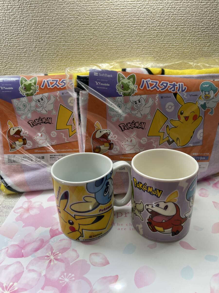> 【非売品】★ポケモン・ピカチュウ★マグカップ2個セット(絵柄違い) &バスタオル2枚セット/SoftBank Y!mobile