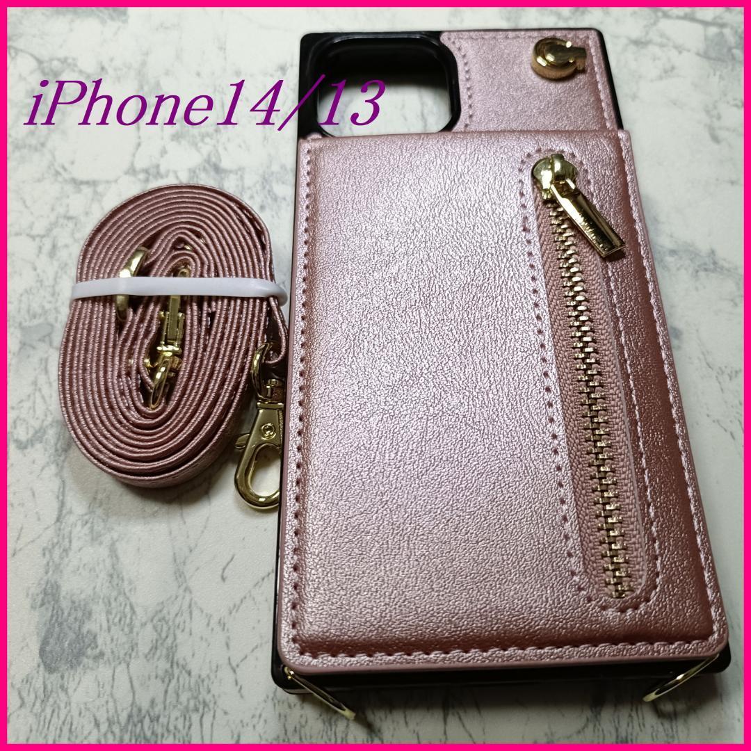 - iPhone14/13 用 スマホケース 肩掛け ネックストラップ ピンクローズ