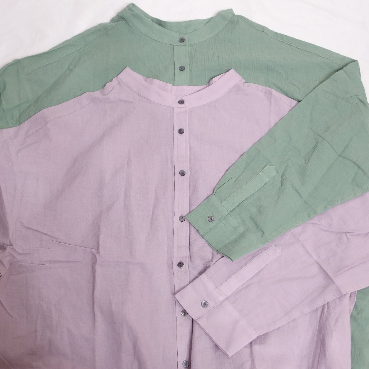 > フェリシモ◆live in comfort 大きいサイズ 七分袖 スタンドカラー ブラウス 2色セット(グリーン&ラベンダー)サイズ3L◆USED美品 I