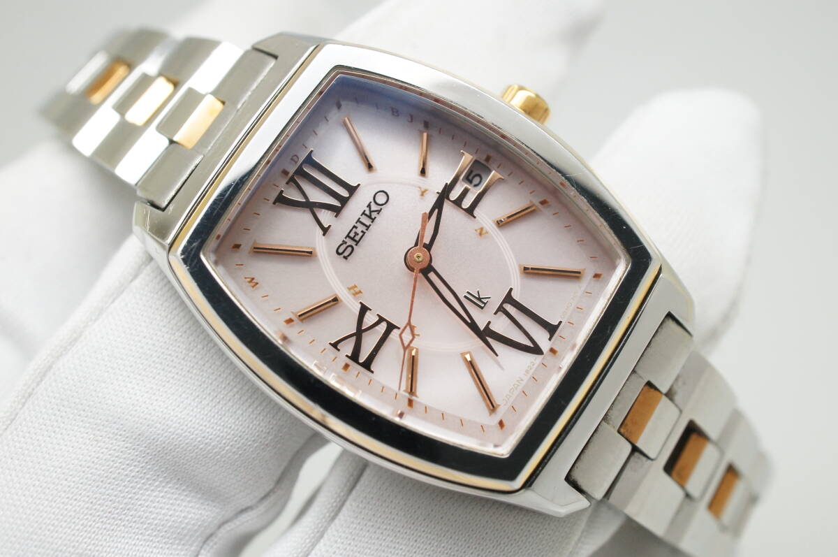 > Z41●作動良好 SEIKO セイコー lk ルキア 電波ソーラー 1B22-0AZ0 トノー型 ピンク文字盤 デイト レディース腕時計 コンビ お洒落