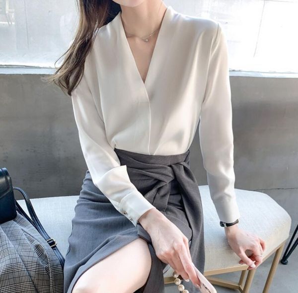 - 新入荷*高品質 シフォン ブラウス 長袖 シャツ エレガント Vネック ビジネス オフイス トップス 着やせ 園行事 通勤 シャツ ブラウス * 白