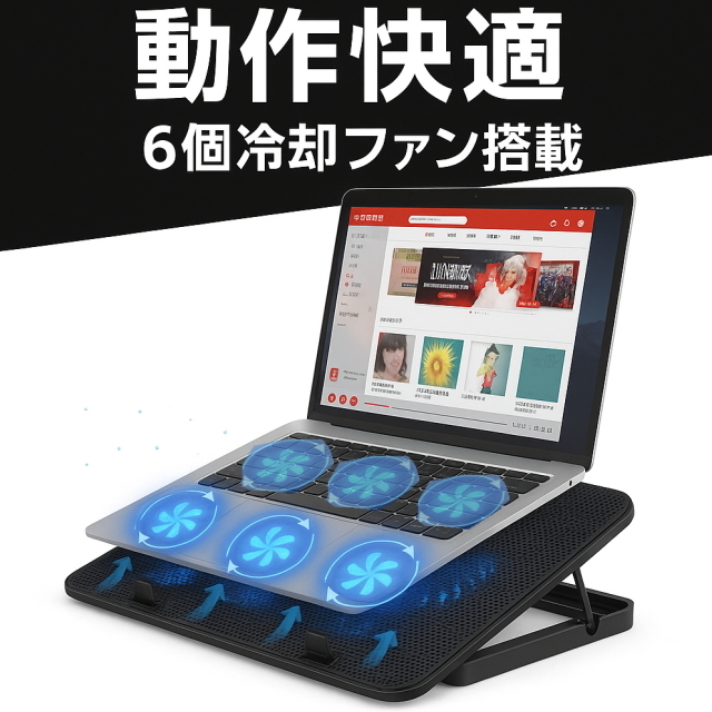 - 【6ファン強力冷却・静音】ノートPCクーラー 冷却パッド ブルーLED 風量調節 高さ調整 USB2口付 夏も快適 長時間作業に最適モデル 新登場