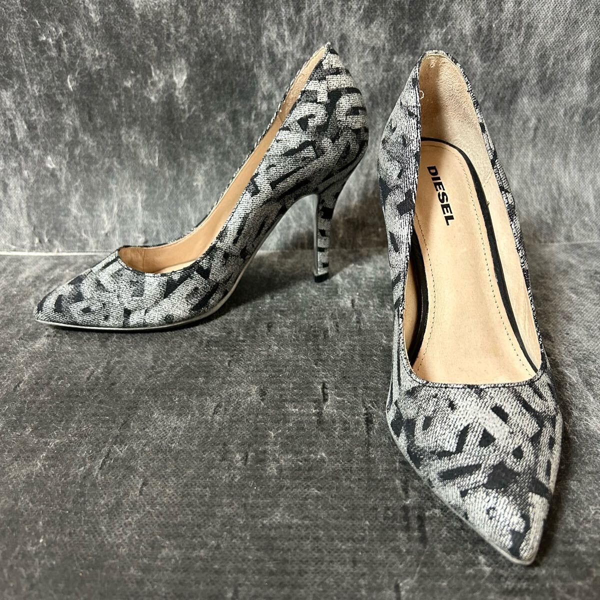 - 【美品】DIESEL ディーゼル ヒールパンプス 総柄 デザインパンプス ヒール9.4cm 36 23cm相当 シルバー ブラック *EN