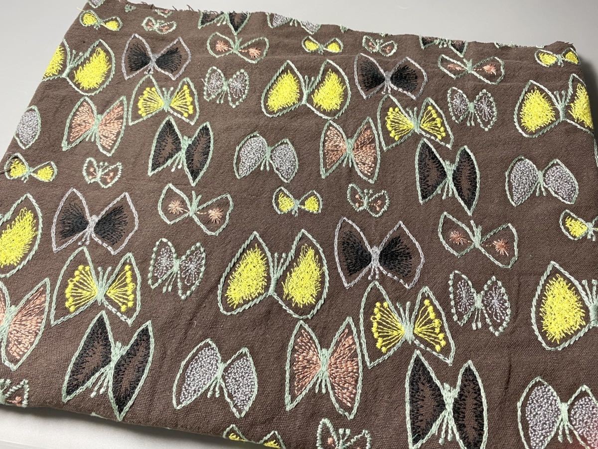 - 刺繍・中厚・リネン生地・幅140cm×50cm・茶地.蝶々