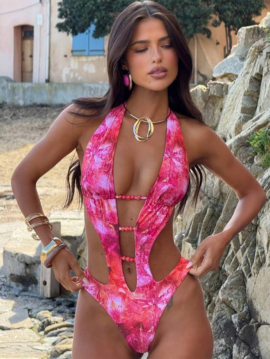 > レディース 水着 ワンピース エレガントなフルボディプリント バックレス 中空 ビーズ ビーチドレス、セクシーで優雅なニットファブ