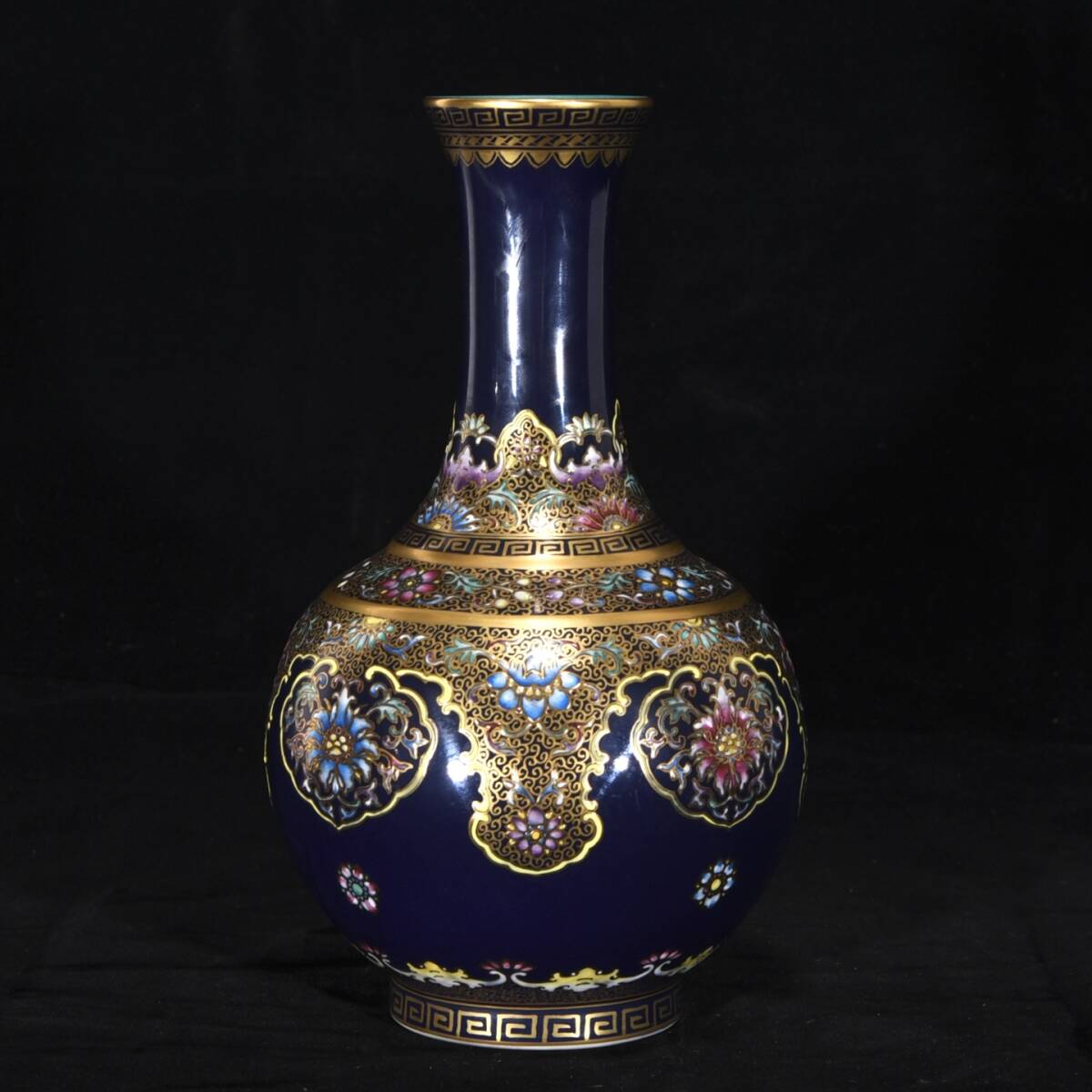 - 9+GV8574「東洋美術」 中国骨董 人間国宝 磁器製品【清朝乾隆期の青釉琺瑯金箔花文観賞用花瓶】 旧物 孤品 珍品 陶磁器 収蔵価値が高い
