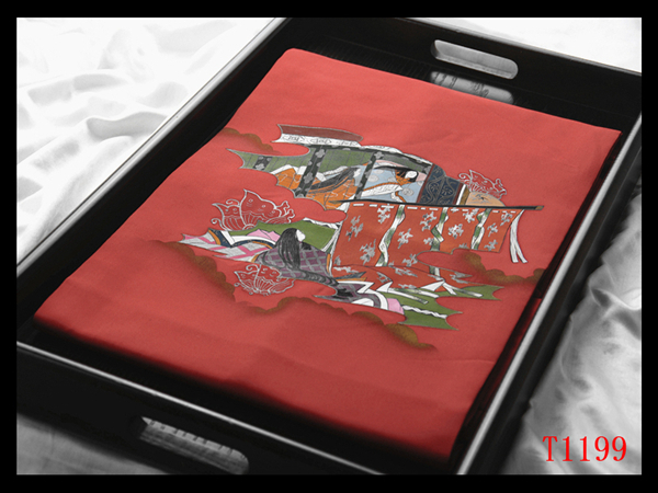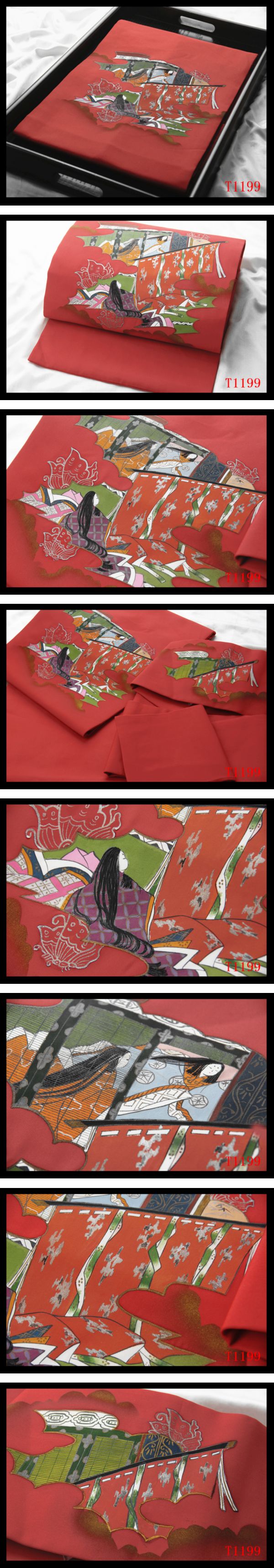 - 蔵【T1199】西陣逸品 塩瀬 手描き 源氏物語 深緋色地 気品豊かに 正絹高級美術名古屋帯 ◇検簪着物袋帯和装小物帯締め