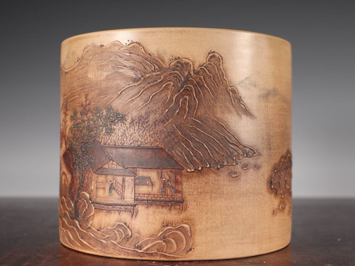 - 唐物 清 紫砂 山水風景 人物紋 筆立て 筆道具 文房具 極細工 中国古玩 骨董品 古美味 D69