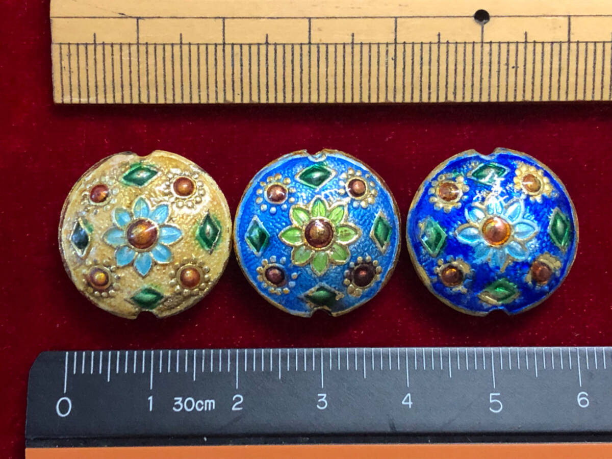 - ¶!¶ 有線七宝焼ワールド - 3色(個)の円盤型玉で1単位c ¶!¶ 約厚8㎜×Φ20㎜円盤型 金線に3色釉満天星花模様 手作 手芸 工芸 インテリア