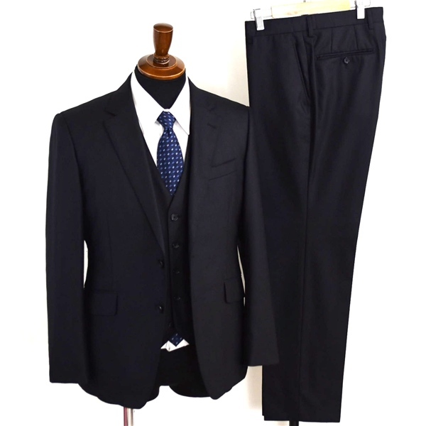 ・春夏秋対応。ベスト付き。2つボタンシングル。袖口4つ釦開き見せ。背抜き。センターベント。フラップポケット。ネーム刺繍なし。