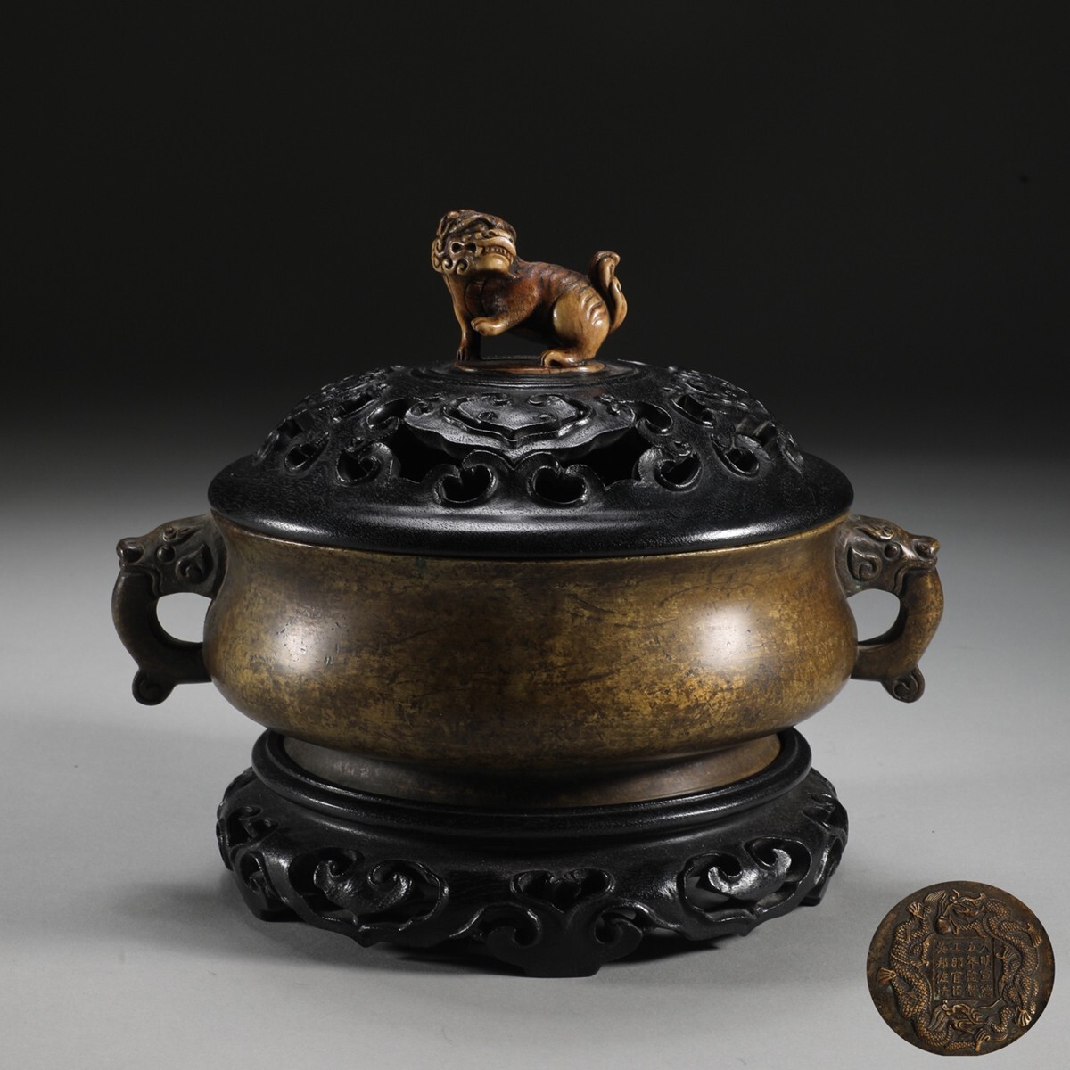 - 「双龍抱 大明宣徳五年監督工部呉邦佐造 古銅彫 龍首耳老銅香薰炉」旧銅器 置物擺件 賞物 中国古美術 旧蔵出