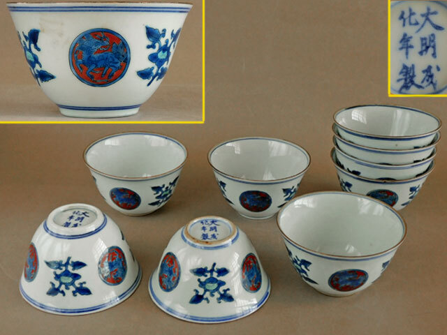 - 大明成化年製 色紙 花 丸紋 麒麟 煎茶碗 九客