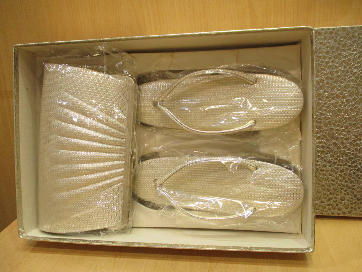 - 草履バッグセット 祝い 銀白 シルバー 和装小物 草履 バッグ 和風 レトロ USED品 箱入り
