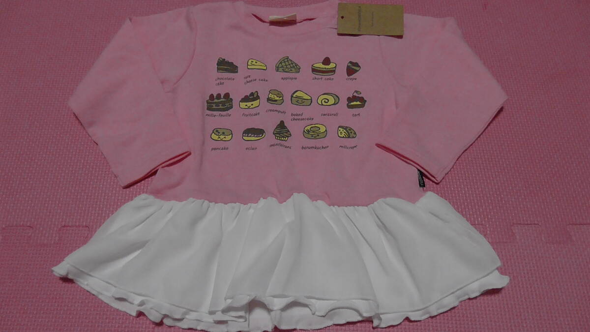 - 新品 100 裾シフォンフリル 長袖トレーナー ピンク かわいい ケーキ スイーツ お菓子柄 保育園 幼稚園 女の子 秋物 春物 95〜 送料無料