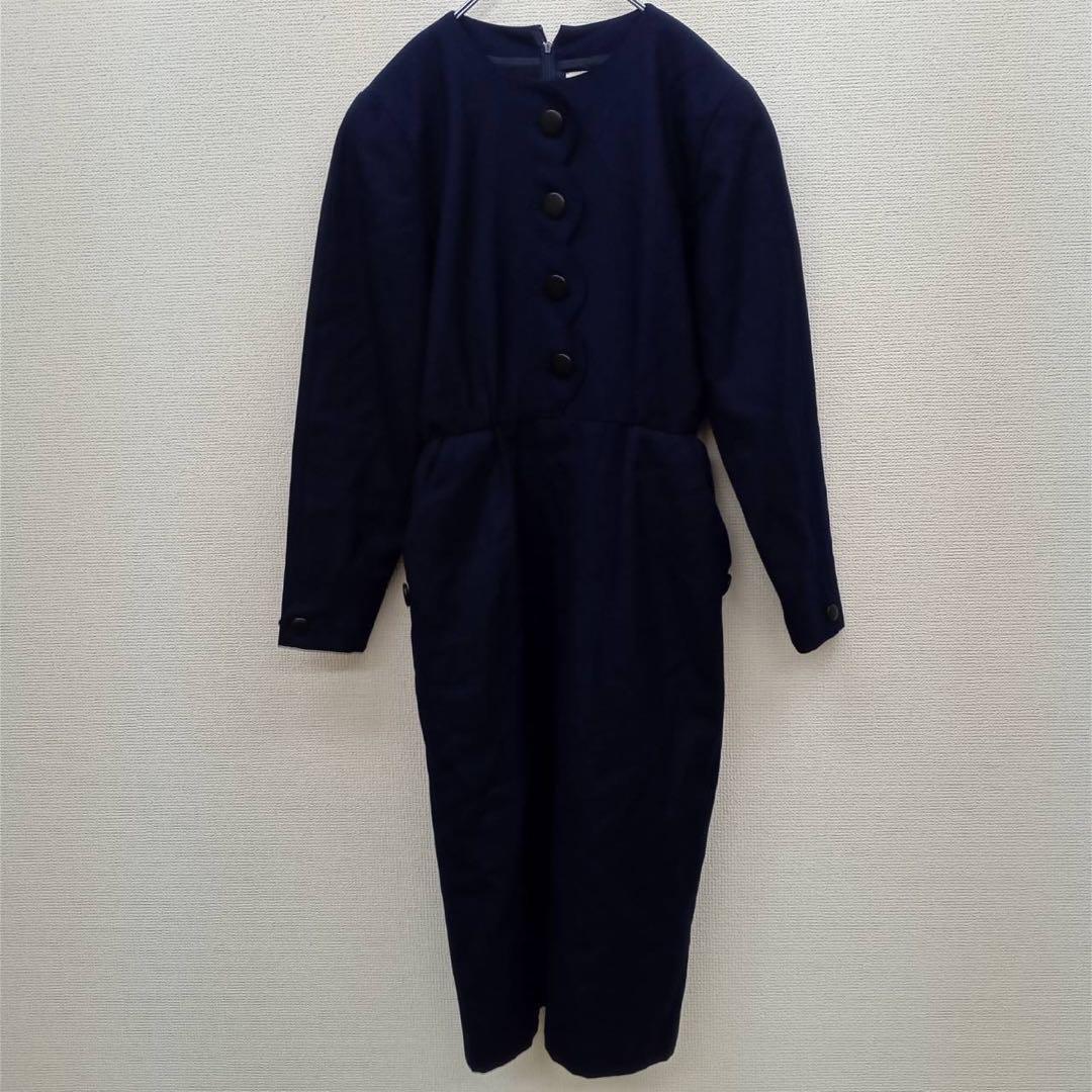 - 馬里邑(9)ひざ丈ワンピース*ノーカラー*ウール100%*ハーフボタン*タイト