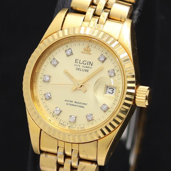 - エルジン デラックス FK285 石付 QZ デイト ゴールド文字盤 レディース腕時計 TKD 2000000 NSK