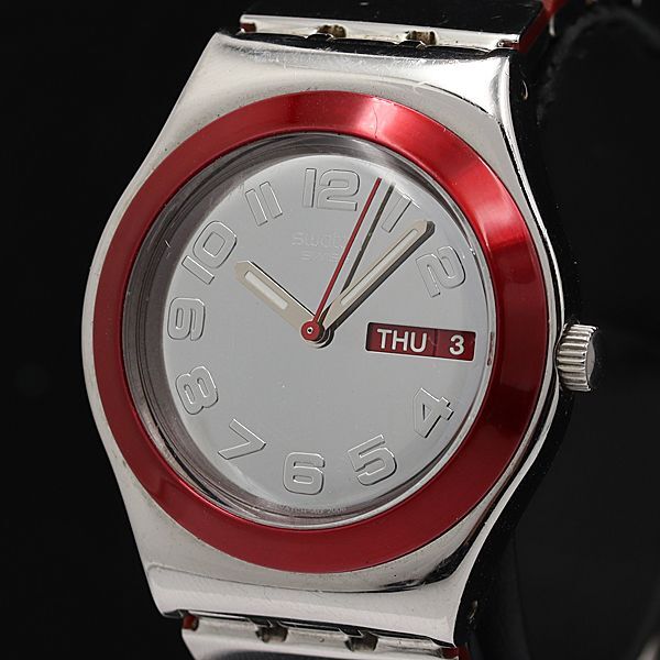 - 稼働 良品 スウォッチ QZ シルバー文字盤 デイデイト アイロニー メンズ腕時計 KMR 2000000 NSK