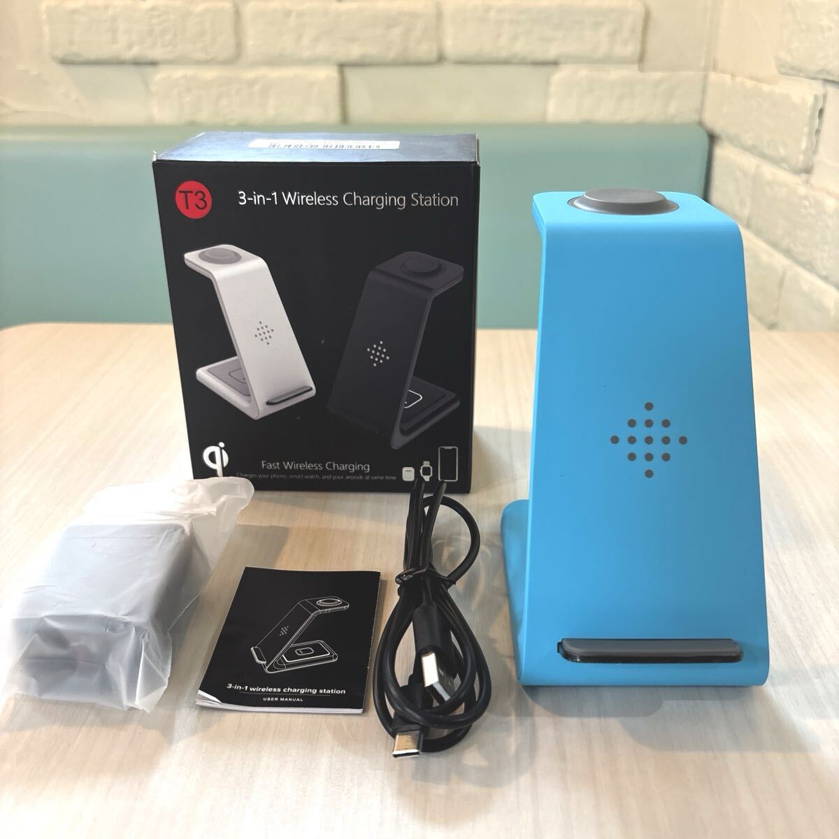 - ワイヤレス充電 3in1 置くだけ充電スタンド 急速充電 Qiスマホ対応 3台同時充電 iPhone/Apple Watch/Galaxy 9V-2AのQC3.0アダプター付属