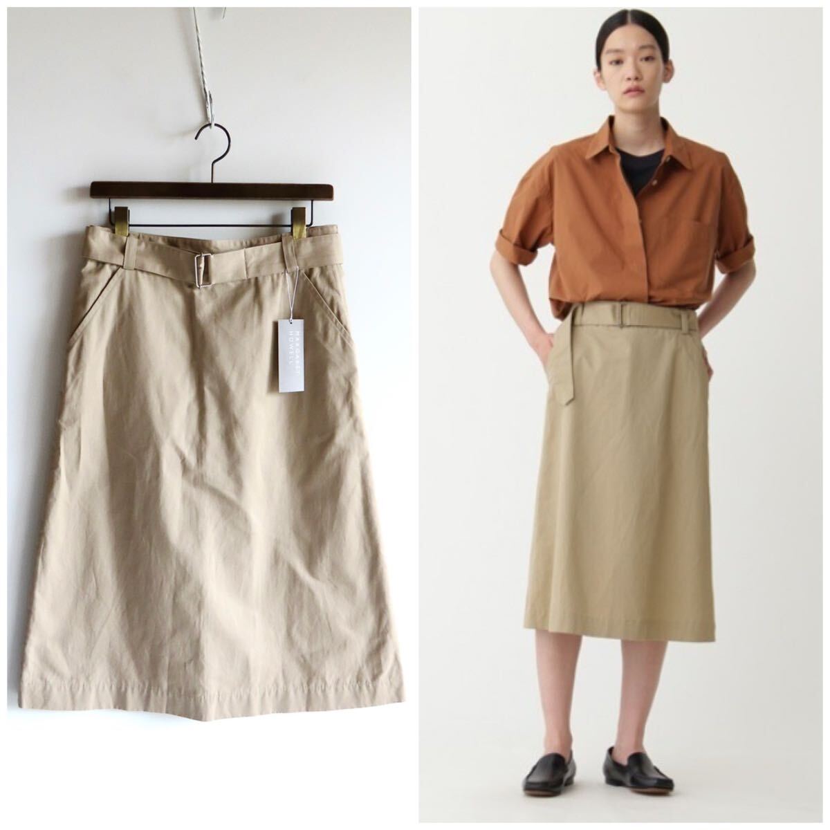 - 新品 22SS MARGARET HOWELL LIGHT COTTON LINEN TWILL マーガレットハウエル ライトコットンリネンツイルスカート 2 M ベルト付 ベージュ系