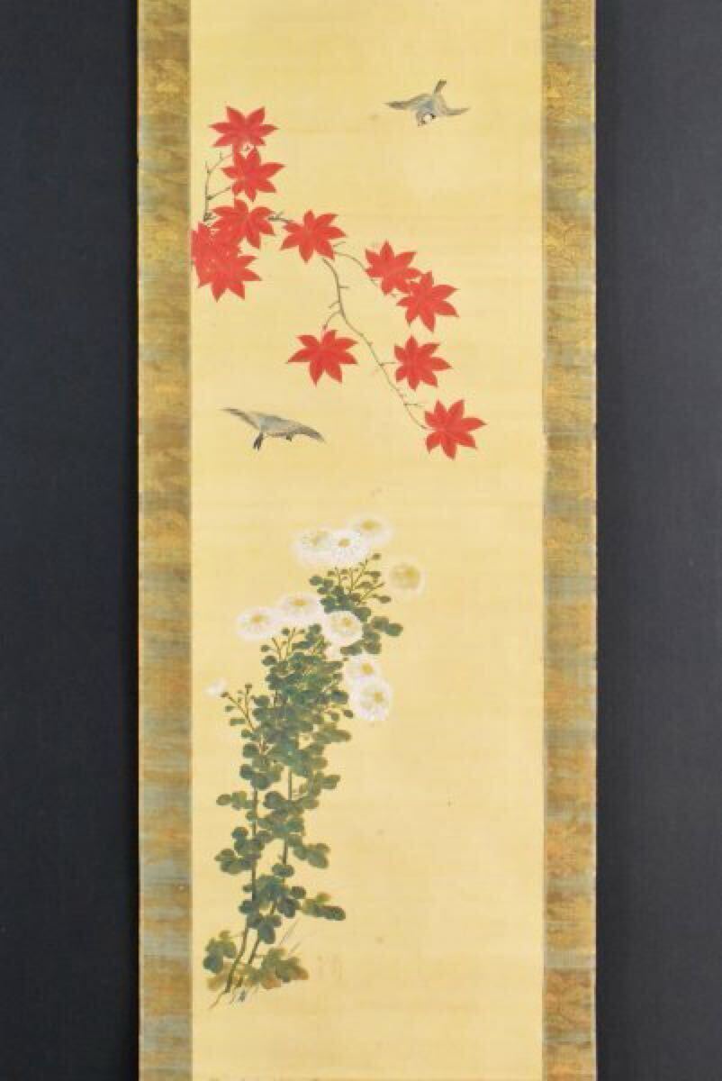 > K4674 模写 渡辺清 渡辺周渓「秋草図」絹本 紅葉 もみじ 菊 花鳥 復古大和 絵画 日本画 茶掛 中国 掛軸 掛け軸 古美術 人が書いたもの