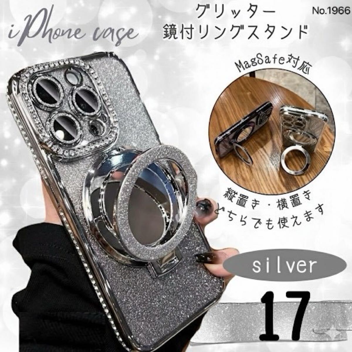 - 新品!グリッター 鏡付 リングスタンド iPhone17ケース シルバー ラメ