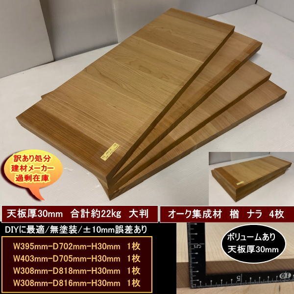 - オーク 楢 ナラ 集成材 端材4点セット 約22kg 無塗装 高級材 395-702-30mm 他3 送料無料 訳あり処分 重量あり DIY