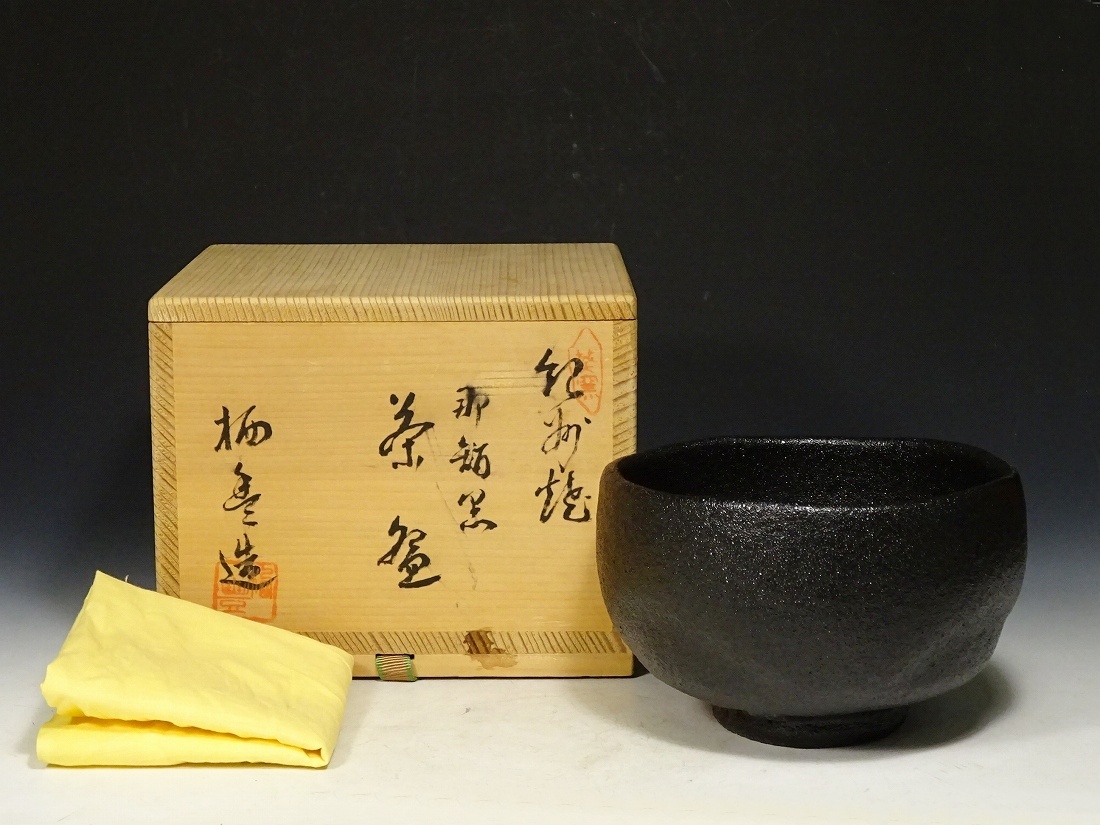 - 6604■寒川栖豊 葵窯 紀州焼 那智黒 茶碗 共箱 茶道具