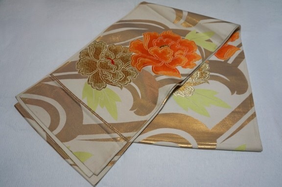 - 中古 袋帯 和装 和服 草花文 織り出し 金銀糸 約412cm