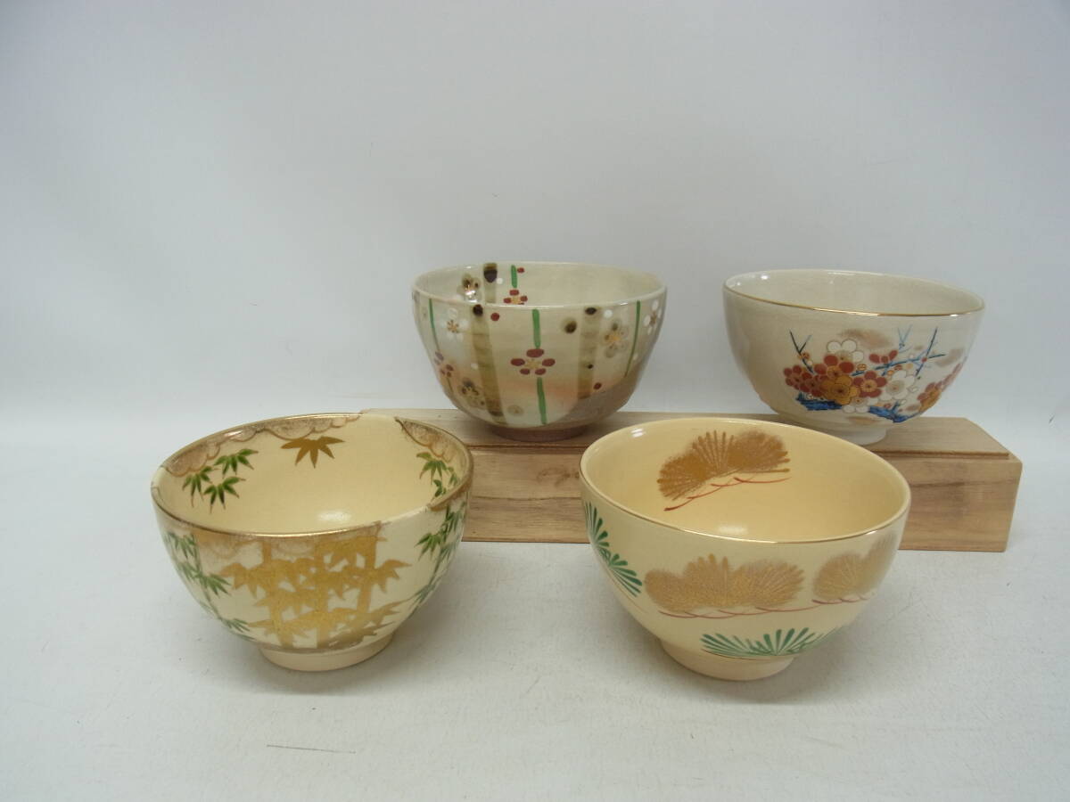 - 4点☆色絵 金彩 松 梅 竹 茶碗☆茶道 茶道具 抹茶碗 梅花 梅図 竹図 松図 京焼 在銘 陶印 中古 60