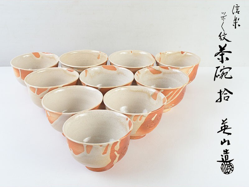 - 茶道具 信楽焼 奥田英山作 つぼつぼ紋 数茶碗 十客 共布 共箱 MKBT