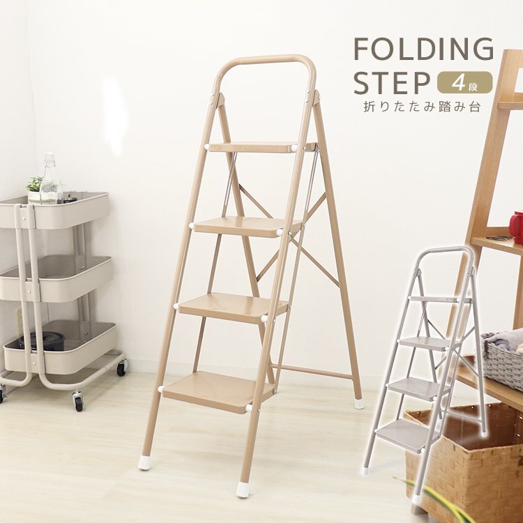 - 脚立 踏み台 4段 折りたたみ ステップ台 耐荷重150kg おしゃれ 滑り止め コンパクト ステップチェア ステップスツール はしご ベージュ