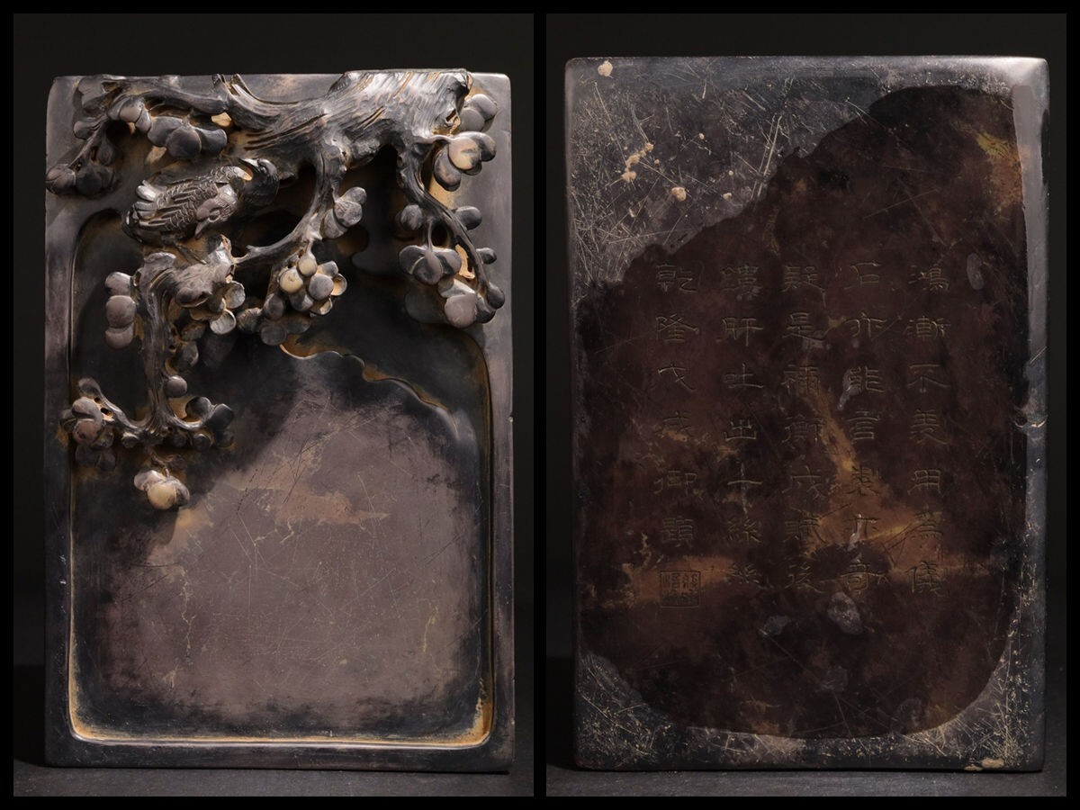 - 「古端石硯 喜上眉梢 春景図文房端渓硯 乾隆戊戌銘 清時代」手彫り 文房四宝 書道具 中国古美術 旧蔵出