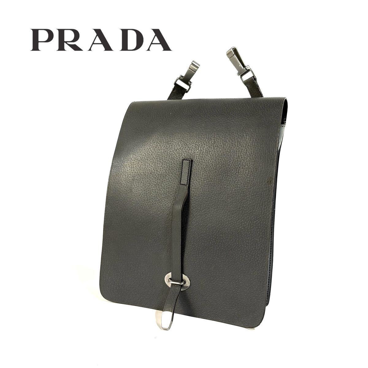 - 【美品】PRADA プラダ レザー ハンドバッグ クラッチバッグ シボ革 三角プレート ブルー グレー シルバー金具 イタリア製