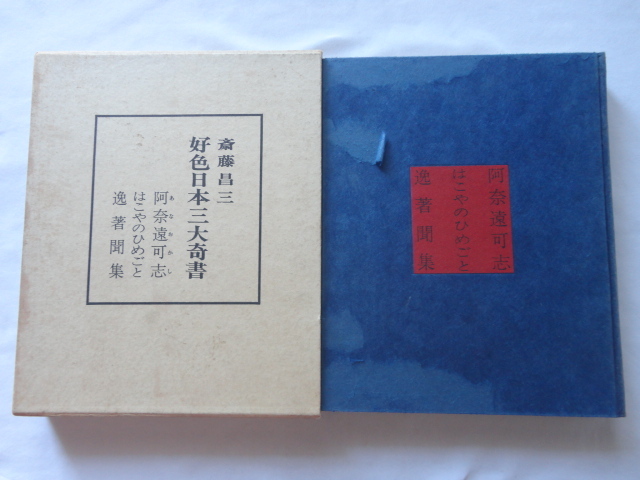 - 『好色日本三大奇書 阿奈遠可志(あなおかし)/はこやのひめごと/逸著聞集』斎藤昌三 昭和41年 初版函 頒価2200円 那須書房