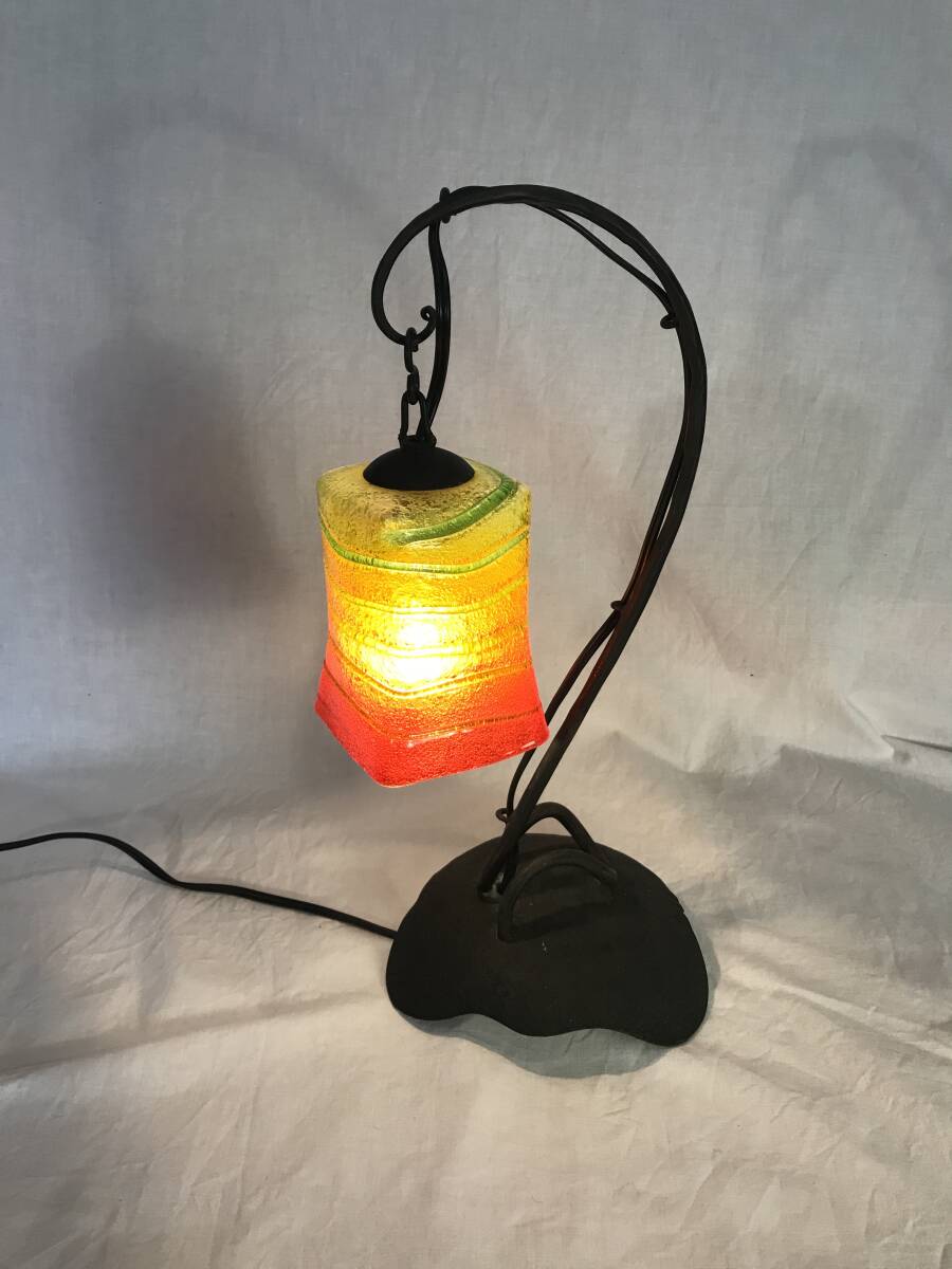 - 沖縄 手吹 琉球ガラス ハンドメイド オレンジ 吊り下げ型 夕陽 鉄製土台 気泡ガラス ランプ 卓上ランプ スタンドライト 工芸品