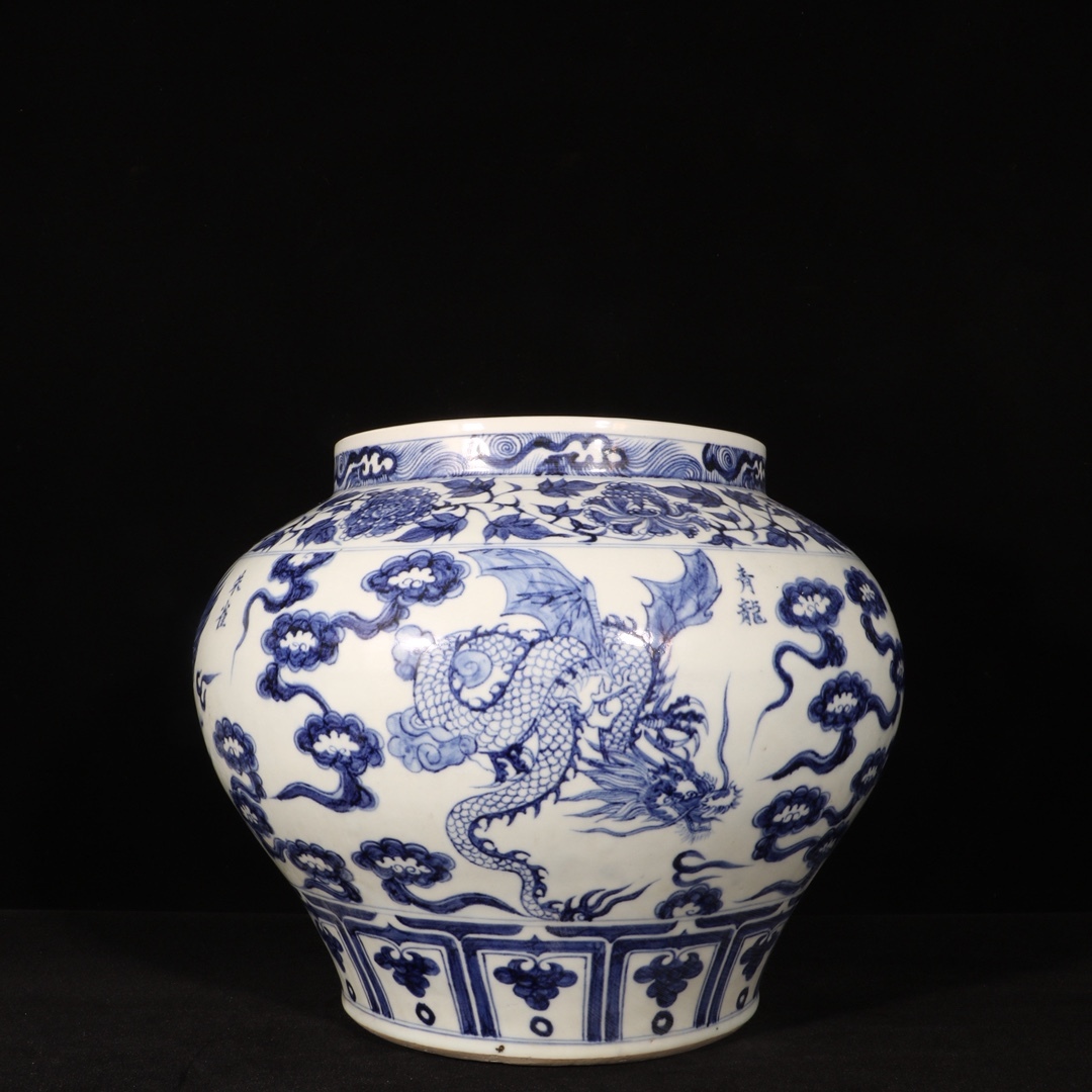 - 元青花 染付 祥雲 神獣文罐 唐物 箱付き 陶磁器 中国美術 古美術 置物 高さ28cm 直径34cm RG605