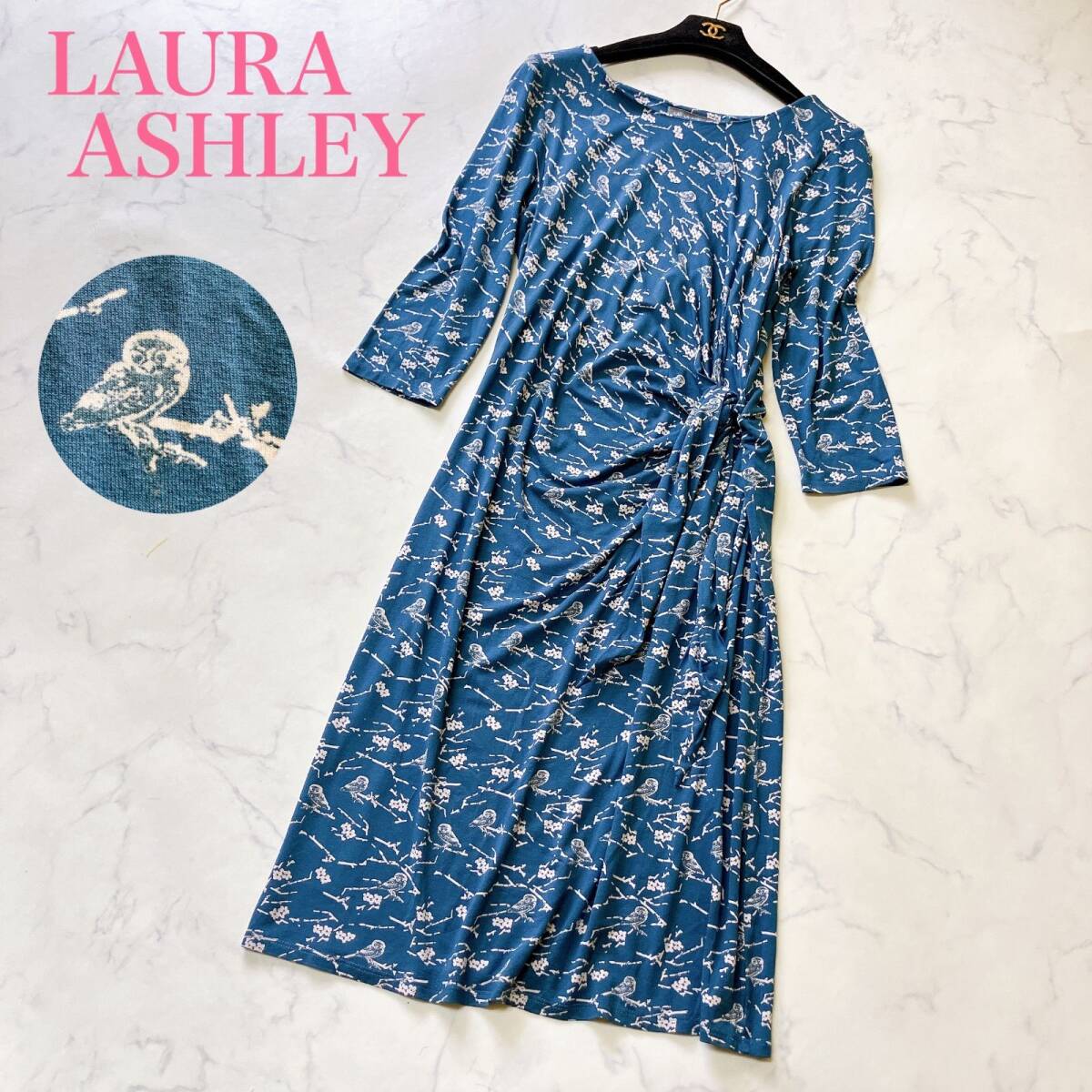 - 美品 ローラアシュレイ ロングワンピース サイドリボン 幸福を呼ぶふくろう柄 総柄 伸縮性あり 七分袖 L