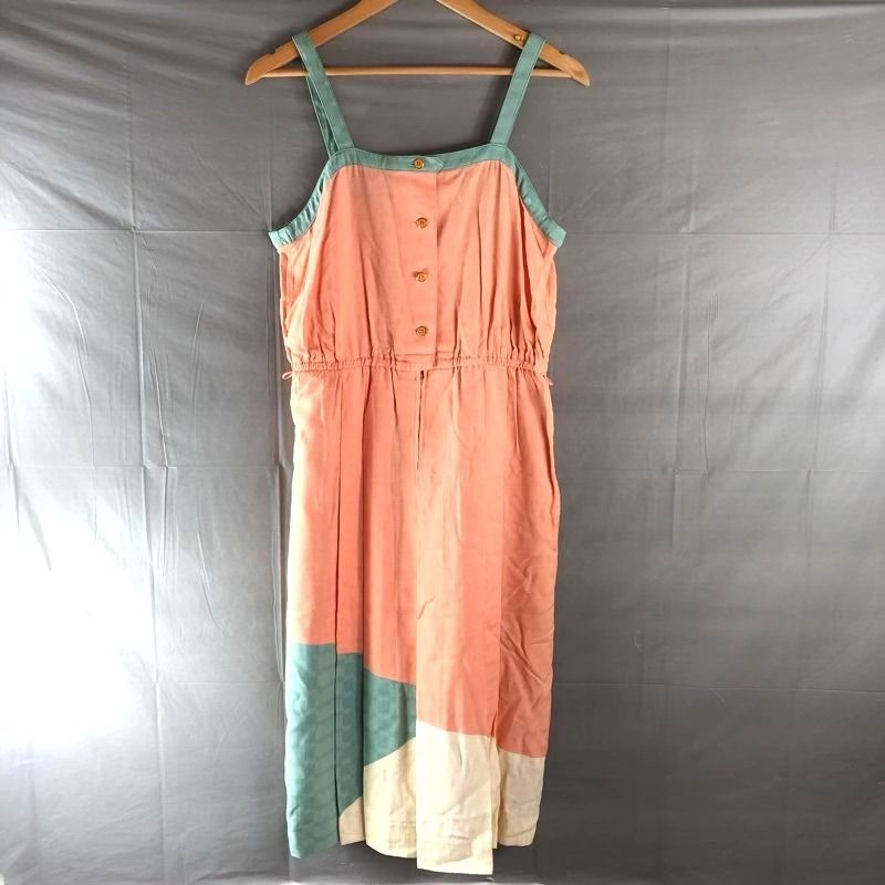 - ワンピース キャミソール ロング 裏地付き ファスナー 金ボタン ウエストゴム入り 綿100% サーモンピンク ミントグリーン ベージュ 13号