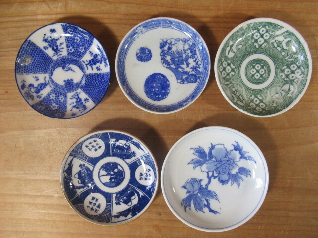 - ◆図変わり印判皿:13:◆5種5枚完品◆『唐子踊り:丸紋賢人:幾何学緑印判:丸紋東屋:染付印判牡丹』◆大正明治◆取り皿:小皿◆
