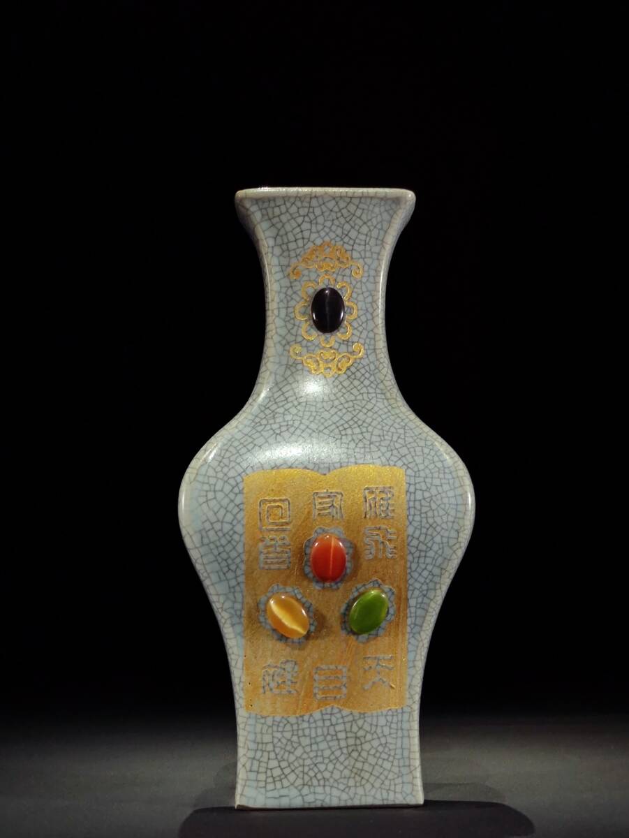 - 9_ZZ9289【惠】人間国宝 中国骨董 陶芸 磁器【哥窯刻字蒔金象眼宝石賞瓶】工芸品 施釉陶 青花磁 陶芸 置物 收藏品