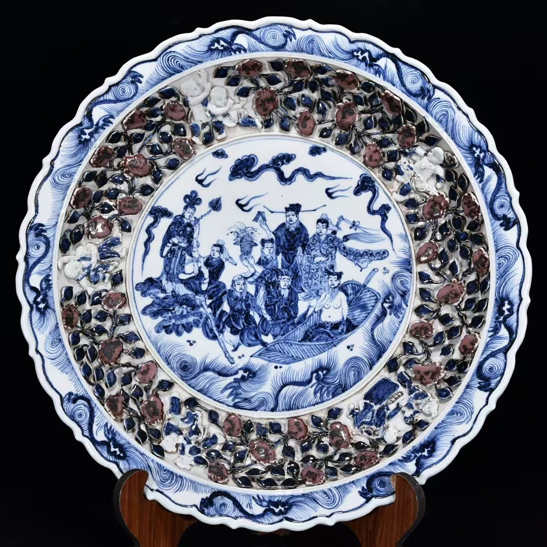 > 磁器 元時代 青花釉里紅捏花八仙人物盤・皿 秘蔵 直径44cm 古陶磁器 陶芸 唐物 古賞物 時代物 骨董品 古置物 中国磁器 古美味 中国古玩921