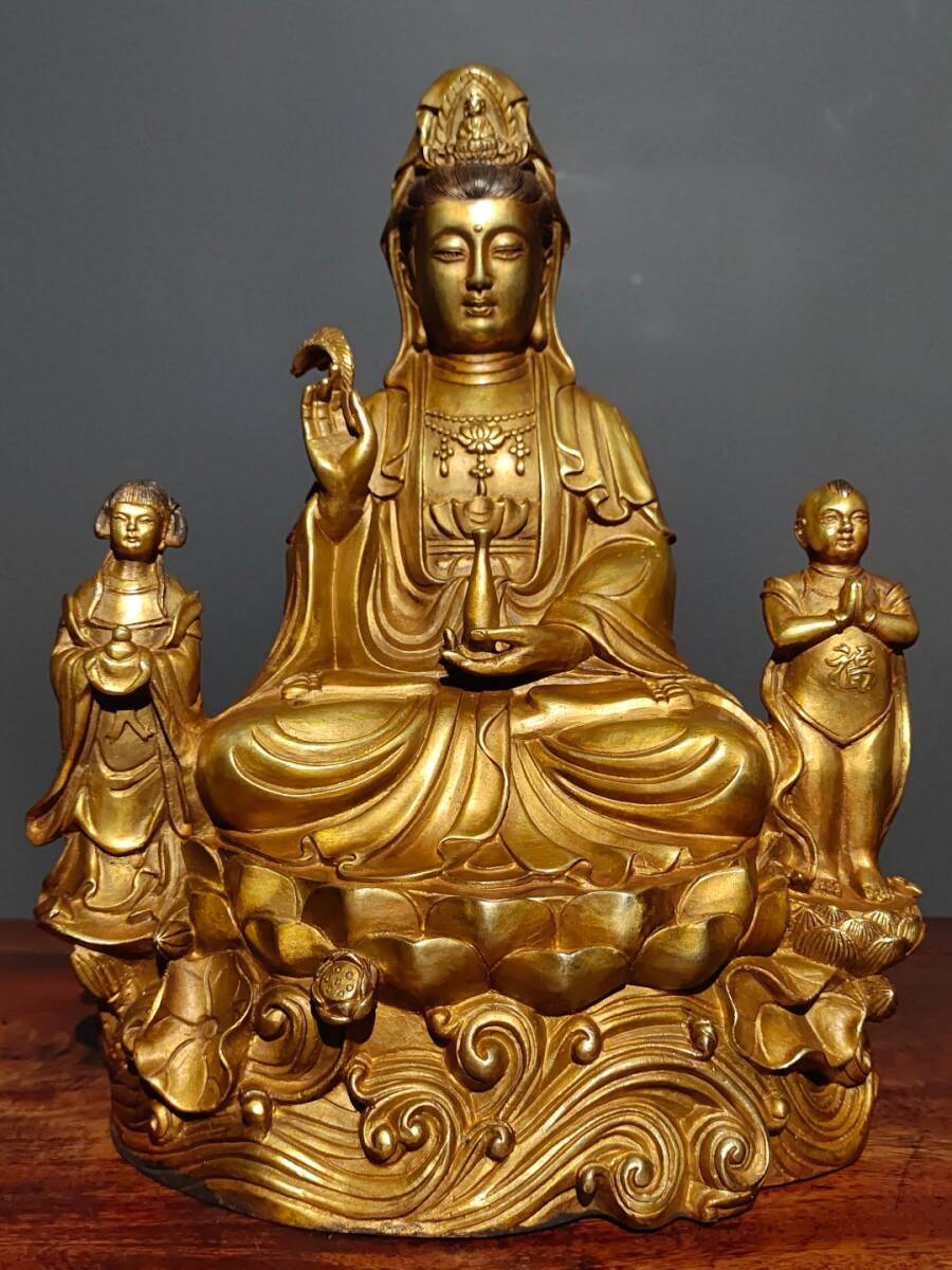 - ▽鴻▽ 銅製 塗金 童子百拜觀音像 仏像 宗教 仏教古美術 供養品 古賞物 古董品 時代物 稀少珍品 中国古玩 中国古美術
