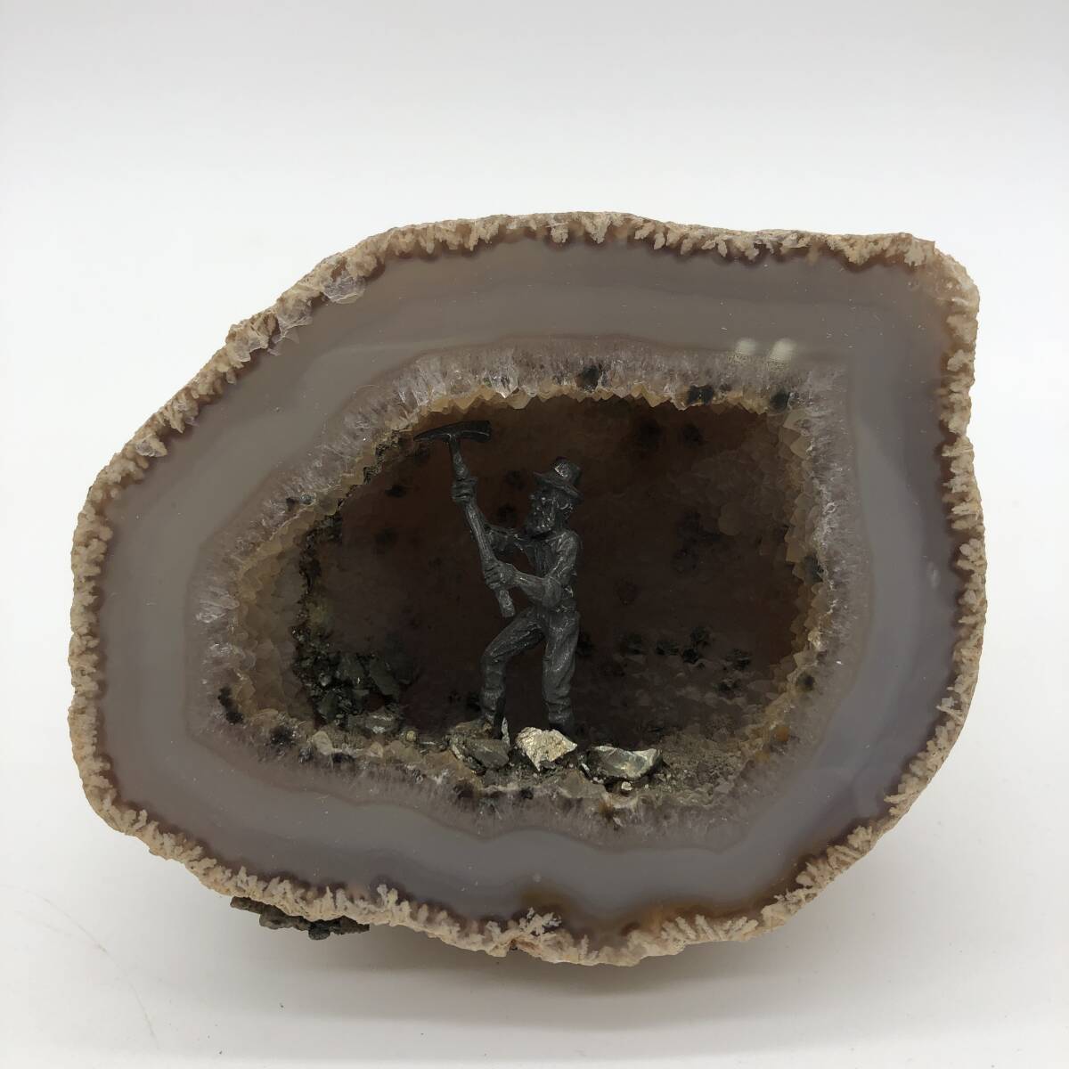 > 【美品】天然ジオードジオラマ ゴールドマイナープロスペクター ~ ジオード内部のピューターフィギュア 天然クリスタルストーン H
