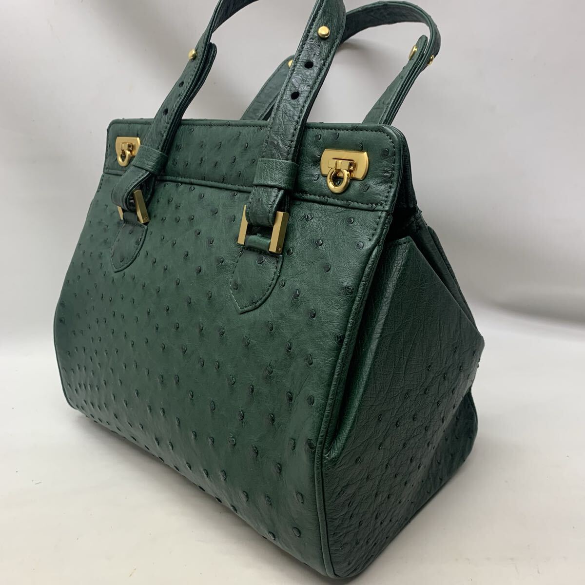 - 【未使用に近い】本革 ガンチーニ 金具ハンドバッグ オーストリッチ 緑 グリーンレディース フォーマル ゴールド金具