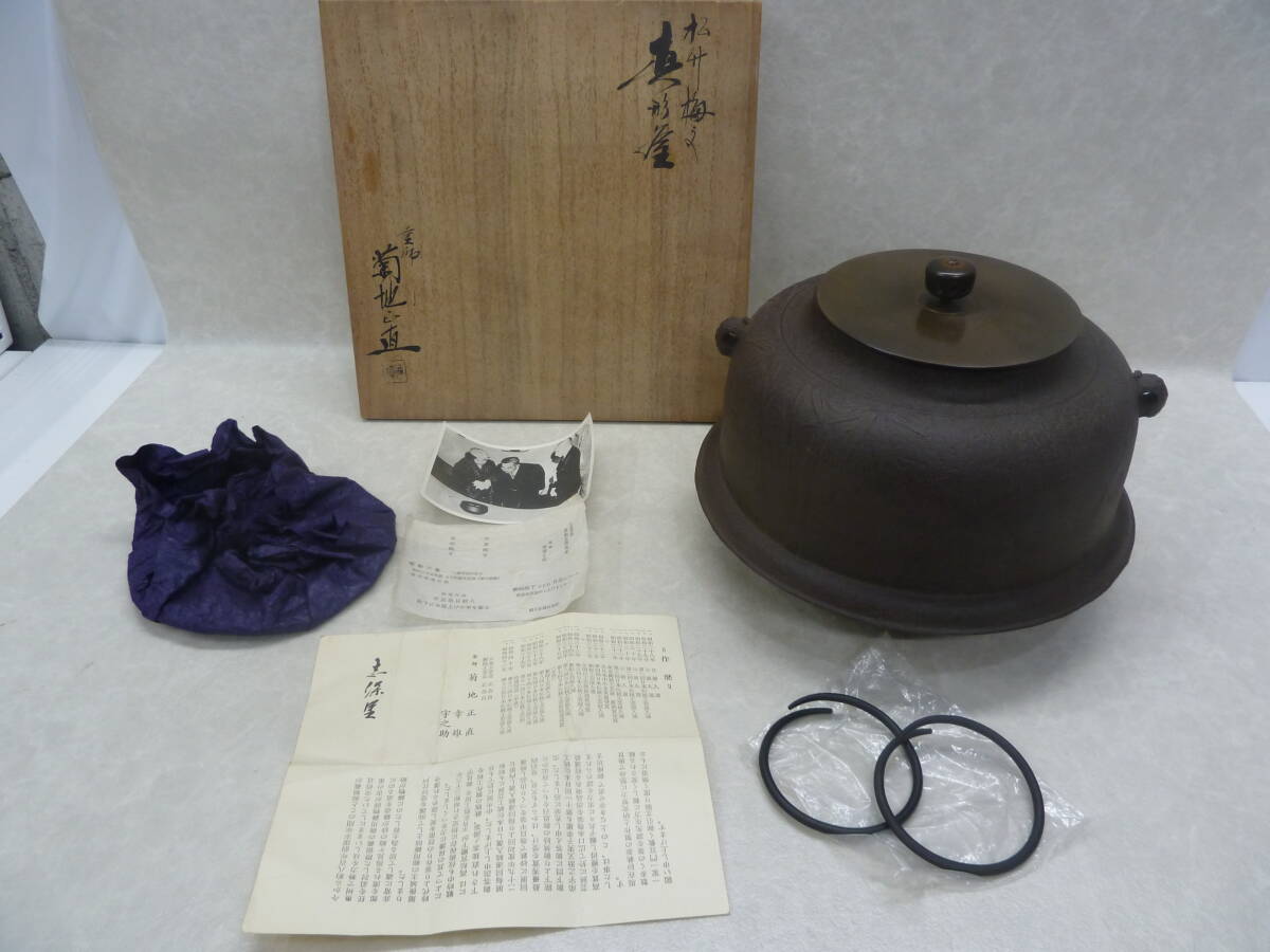 - #43745 釜師 菊地正直造 松竹梅 真形釜 茶釜 鉄釜 共箱 説明書付き
