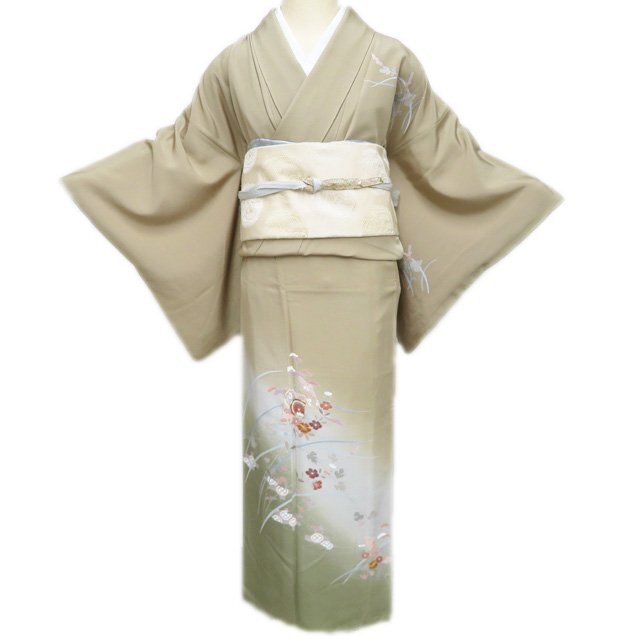 > 訪問着 着物 中古 正絹 袷 フォーマル 金駒刺繍 花の図 青朽葉色 多色 身丈156cm 裄63cm M きもの北條 A1272-25